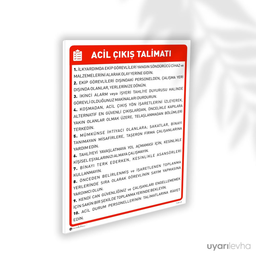 Acil Çıkış Talimatı Uyarı Levhası. Acil çıkış ile ilgili tüm uyarı levhalarına “bu kategoriden” ulaşabilirsin.