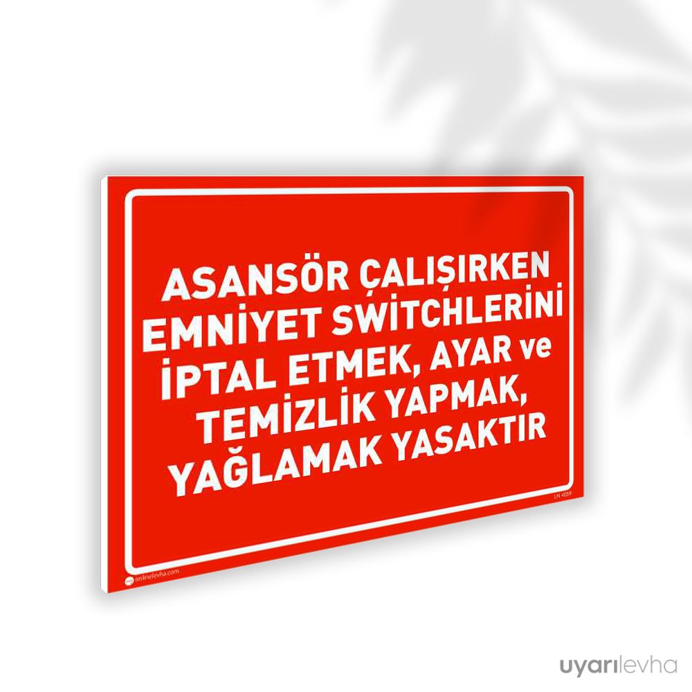 Asansör Çalışırken Emniyet Switchlerini İptal Etmek Temizlik ve Yağlama Yapmak Yasaktır İkaz Levhası